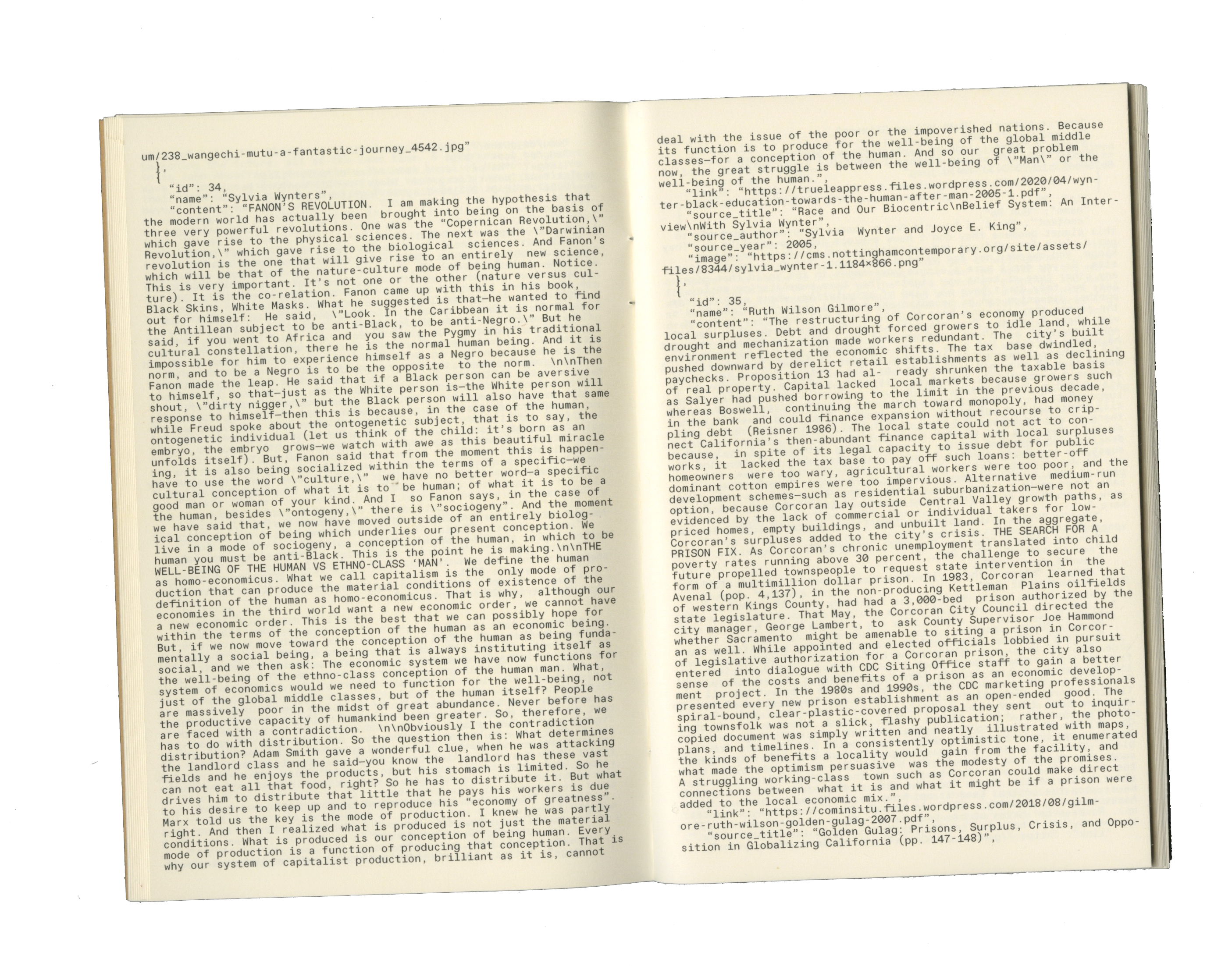 Through foraging seed data related to biotechnology, poetry, abolition, southern self taught art and more—YouTube transcripts, found PDFs, website text, poems, journalism articles, etc.—are blended into a non-linear, choral hymn and Cy’s voice emerges. I have written a JavaScript program that splits paragraphs at punctuation marks such as periods and randomly recombines the paragraphs using a shuffling algorithm, resulting in Cy’s Narration and a woven world on the page. In many ways, Cykofa: The Seeda Origin Story was not written — it was grown.