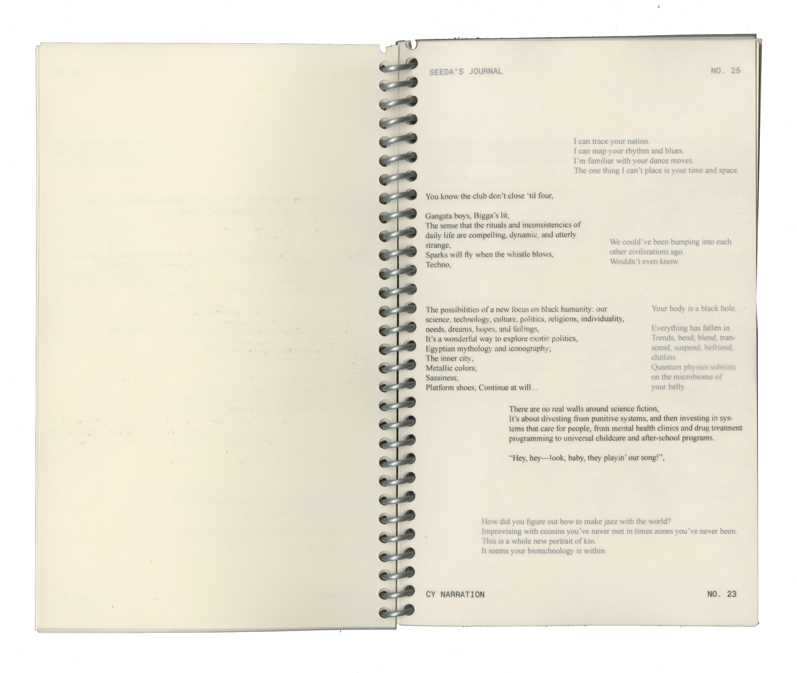 I completed the printing, cutting, and binding at Studio Two Three in Richmond, Virginia. The book features a risograph printed cover and vellum sheets as an experiment in translucency and opacity. Printing on vellum allowed me to create three narratives in one book: Seeda’s Journal Entries, Cy’s Narration, and both read together. Printing on translucent paper also creates material echoes to the story itself, reinforcing the parallel universe theme and the layering process of the Cykofa Narration methodology and my risograph printmaking practice.