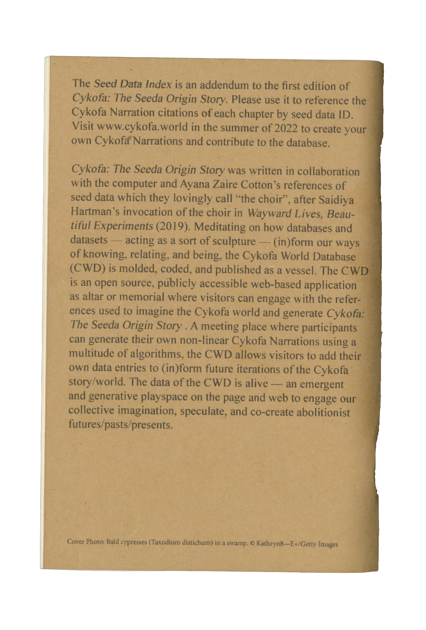 Remembering that we can store data into the DNA of plants and read information from a tree's rings through dendrochronology, I developed Cykofa Narration as a methodology. Cykofa Narration is a storytelling technology/methodology that relies on ecosystems reverence, collective voice, re-appropriation, and computer collaboration. Developed and published during the Ginkgo Bioworks Creative Residency, Cykofa: The Seeda Origin Story is a long-form poetry narrative told through the journal entries of a non-binary biotechnologist named Seeda and the found data within an ancient, 2,600+ year-old bald cypress tree named Cy. Our narrator is a tree but also a portal, allowing us to traverse deep time and connections. The people of Cykofa have traditionally hosted their data within the DNA of their trees, but what happens when Seeda discovers a rip in the dendrochronological memory, exposing select datasets from our world?